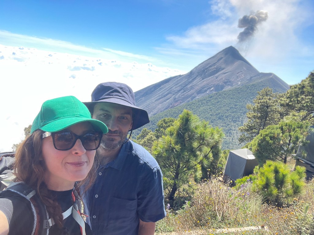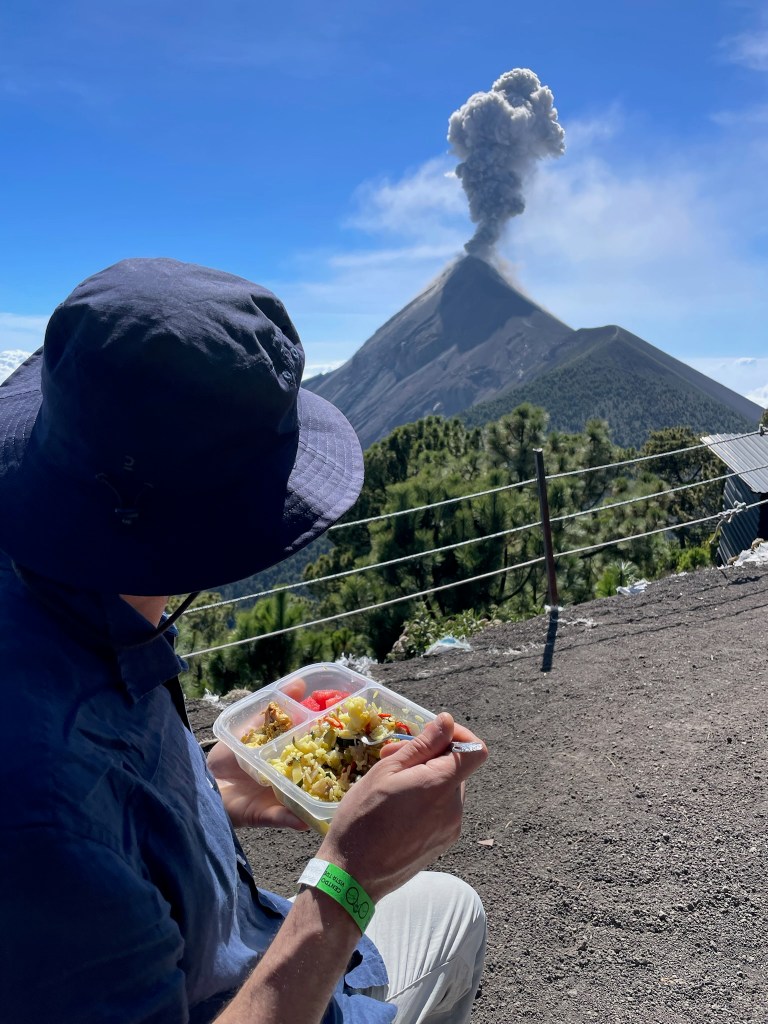 Nous arrivons vers 13h au camp de base, constitué de cabines spartiates et de toilettes sèches. Tout est propre (ne nous voilons pas la face tout de même, les sacs de couchages et couvertures ne sont pas lavées tous les jours mais là n’est pas l’important) et fonctionnel. Nous partagerons la cabine avec Lisa et Vincent, deux maraîchers français. La vue sur le volcan Fuego est incroyable et les éruptions régulières rythment notre déjeuner pris avec nos colocataires et un autre couple de français, Matthieu et Emmanuelle.