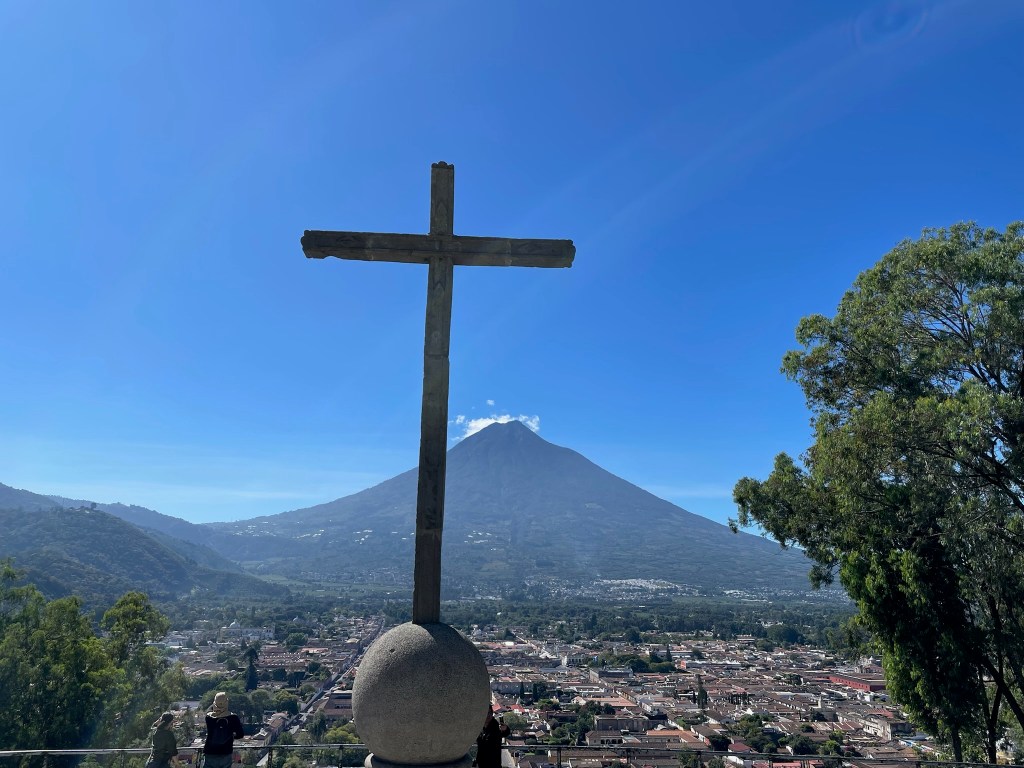 Nous prenons d’abord la direction du Cerro de la Cruz, un point de vue imprenable sur Antigua et l’imposant Volcano de Agua qui domine la ville. Le sentier est aménagé et en haut des vendeurs de glaces, granizas et souvenirs pullulent. La vue est superbe et nous en profitons le temps qu’il faut.