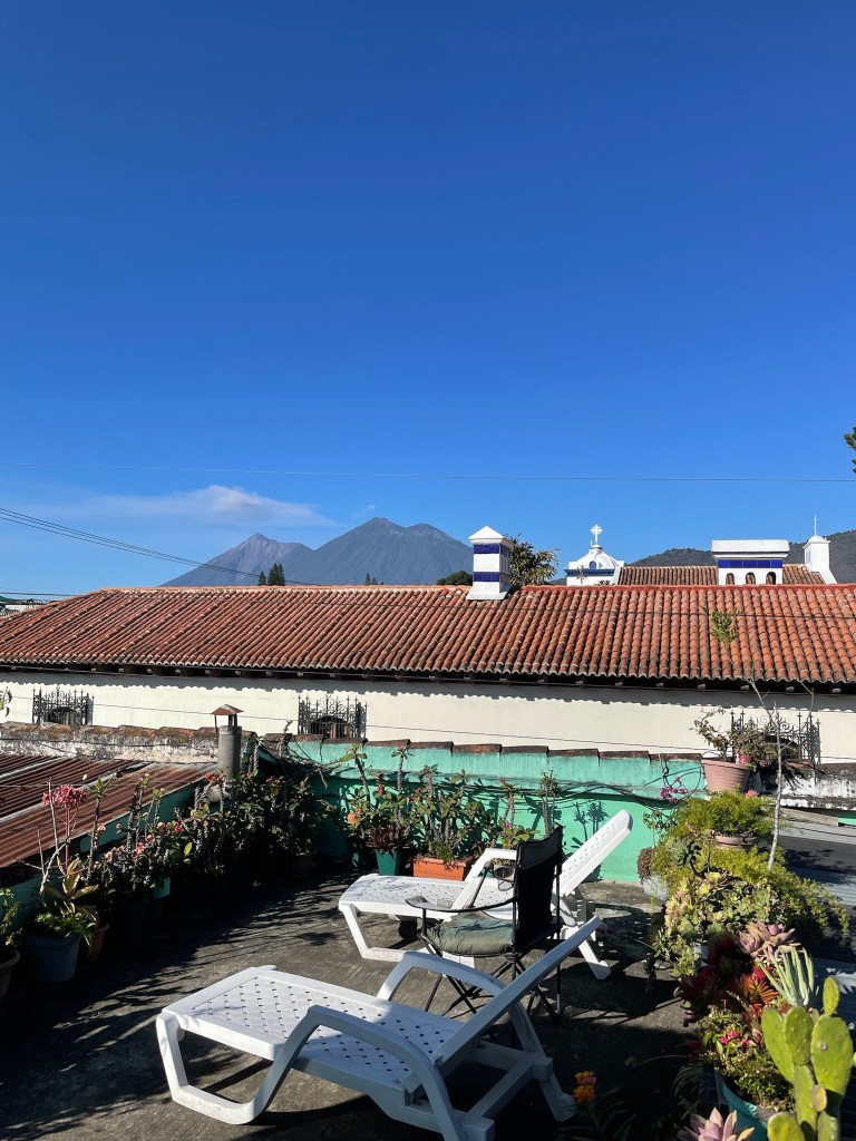 Après avoir quitté notre guide Alfredo, nous retournons à la casa de Leon pour travailler un peu sur le blog autour d’une bière sur le toit terrasse avec vue sur les volcans Agua, Acatenango et Fuego. Ce dernier est toujours en activité et crache régulièrement des volutes de fumée. Nous irons le voir de plus près dans deux jours.