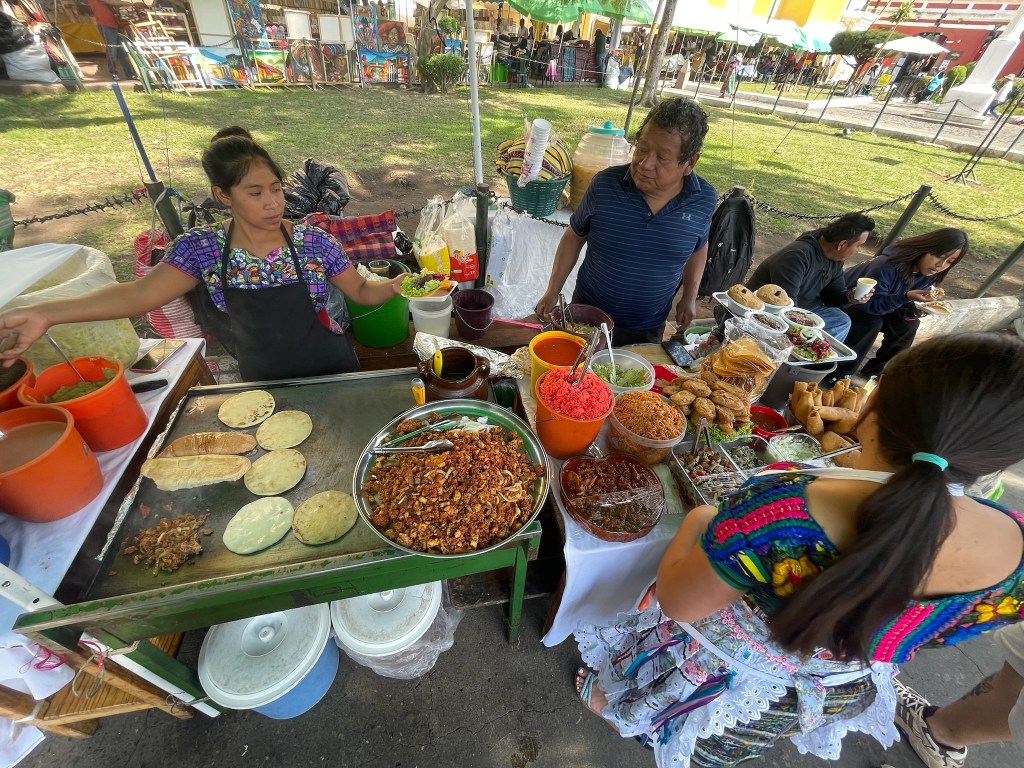 Il est ensuite temps de se diriger vers la station de bus pour notre prochaine étape, sans oublier de passer au marché au pied de la Merced pour y déjeuner sur le pouce. Buffalo sandwich (mix de viandes dans un pain brioché) pour moi, tostada (grande chips tortilla recouverte de guacamole, haricots rouges et légumes fermentés) pour Emie.