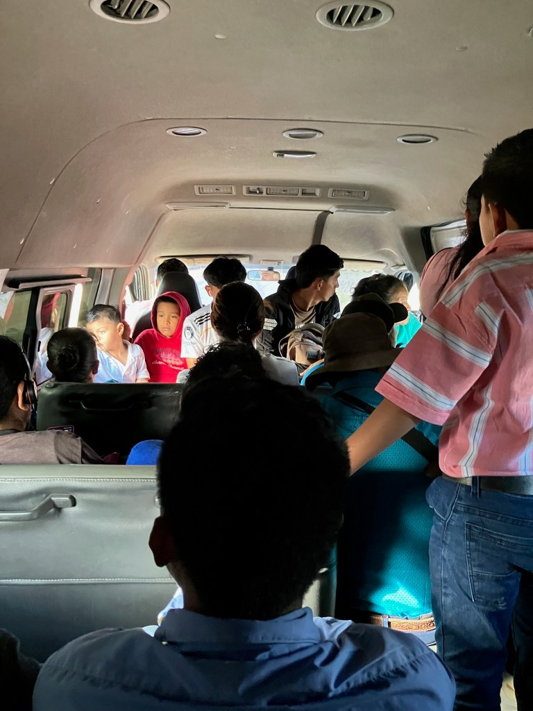 Nous nous apercevons aussi qu’ici il n’y a pas du tout les mêmes normes que chez nous (d’ailleurs y’en a-t-il ne serait-ce qu’une seule ?). Nous avons déjà vu qu’un chauffeur peut conduire pendant 11h avec seulement deux petites pauses. Là, le van 15 places assises va aller jusqu’à contenir 27 personnes !